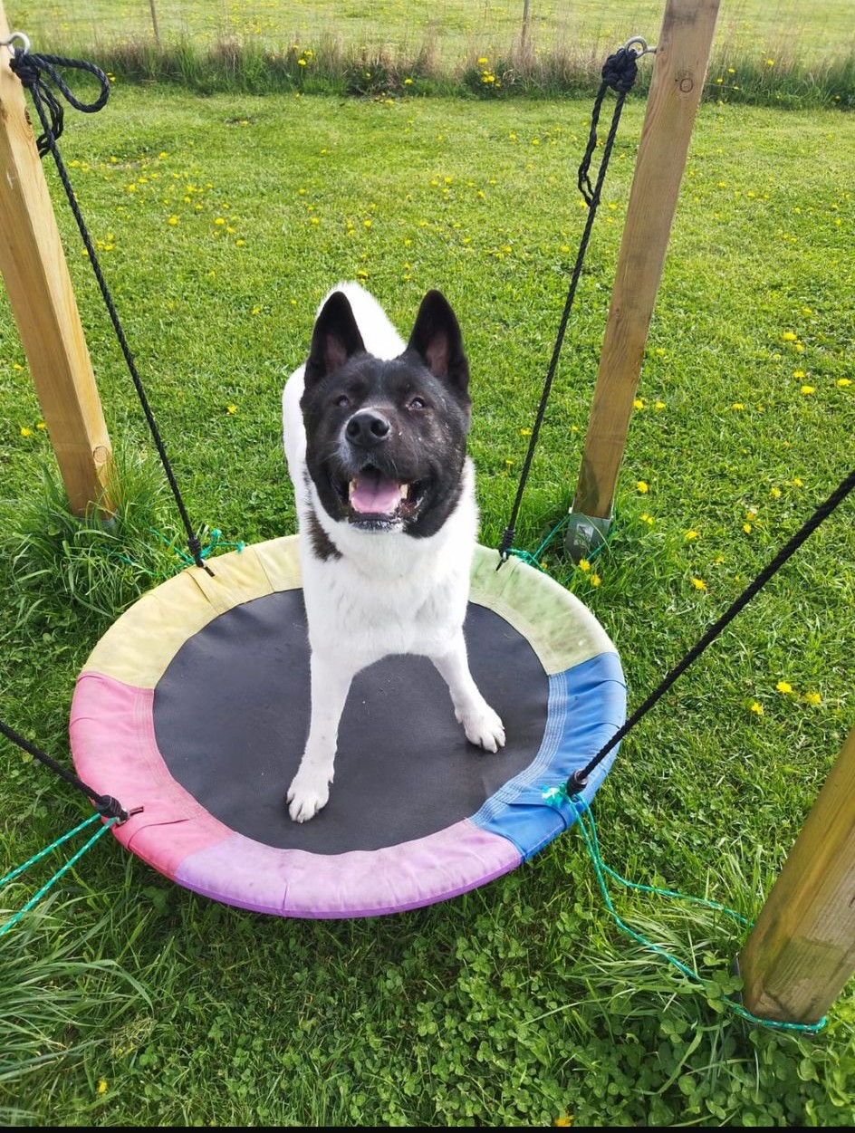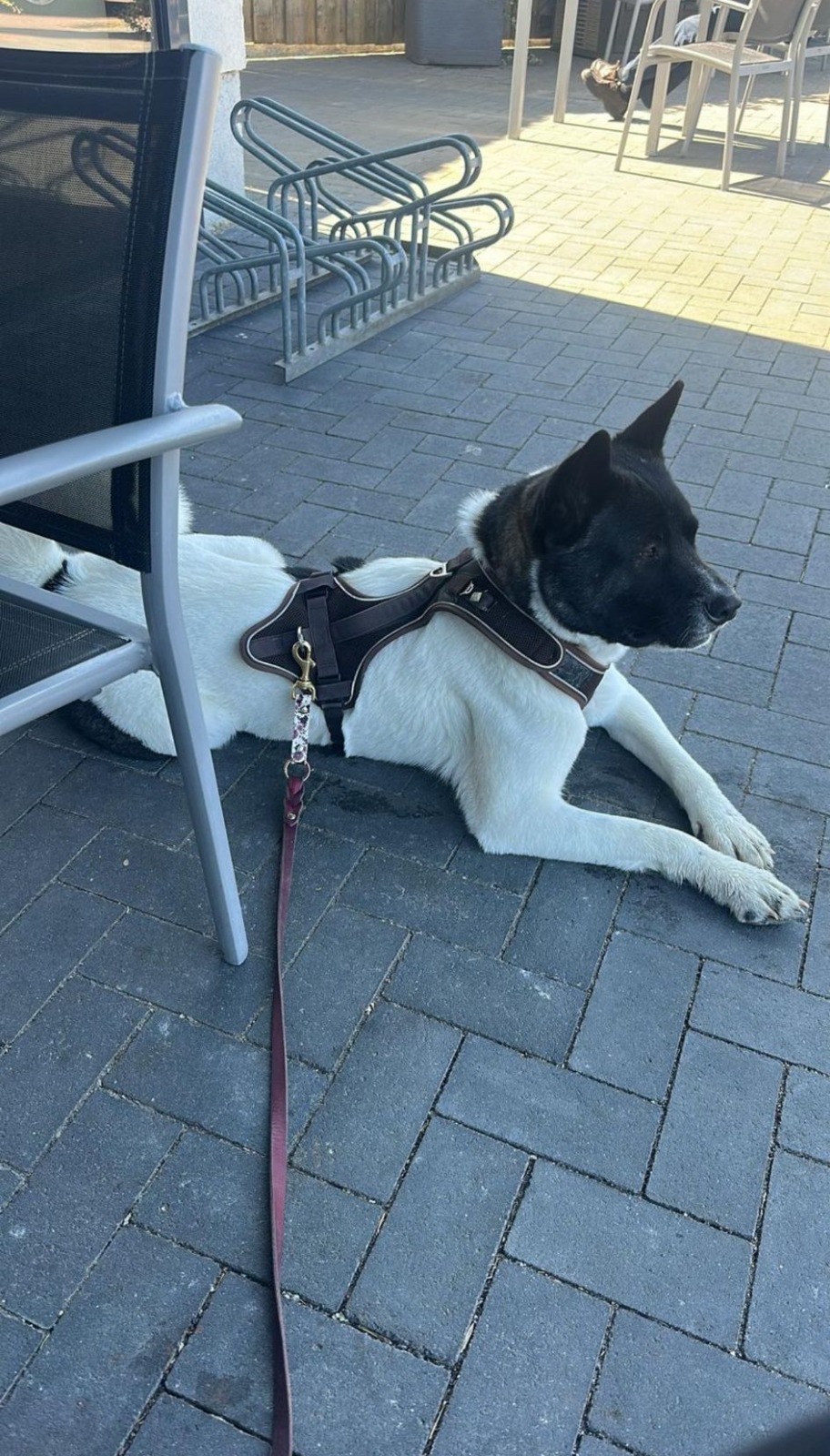 Vermutlich zeigt Amon Anzeichen von HD/ED und Patella, kommt aber gut damit zurecht und genießt Spaziergänge und gemeinsame Aktivitäten in vollen Zügen.