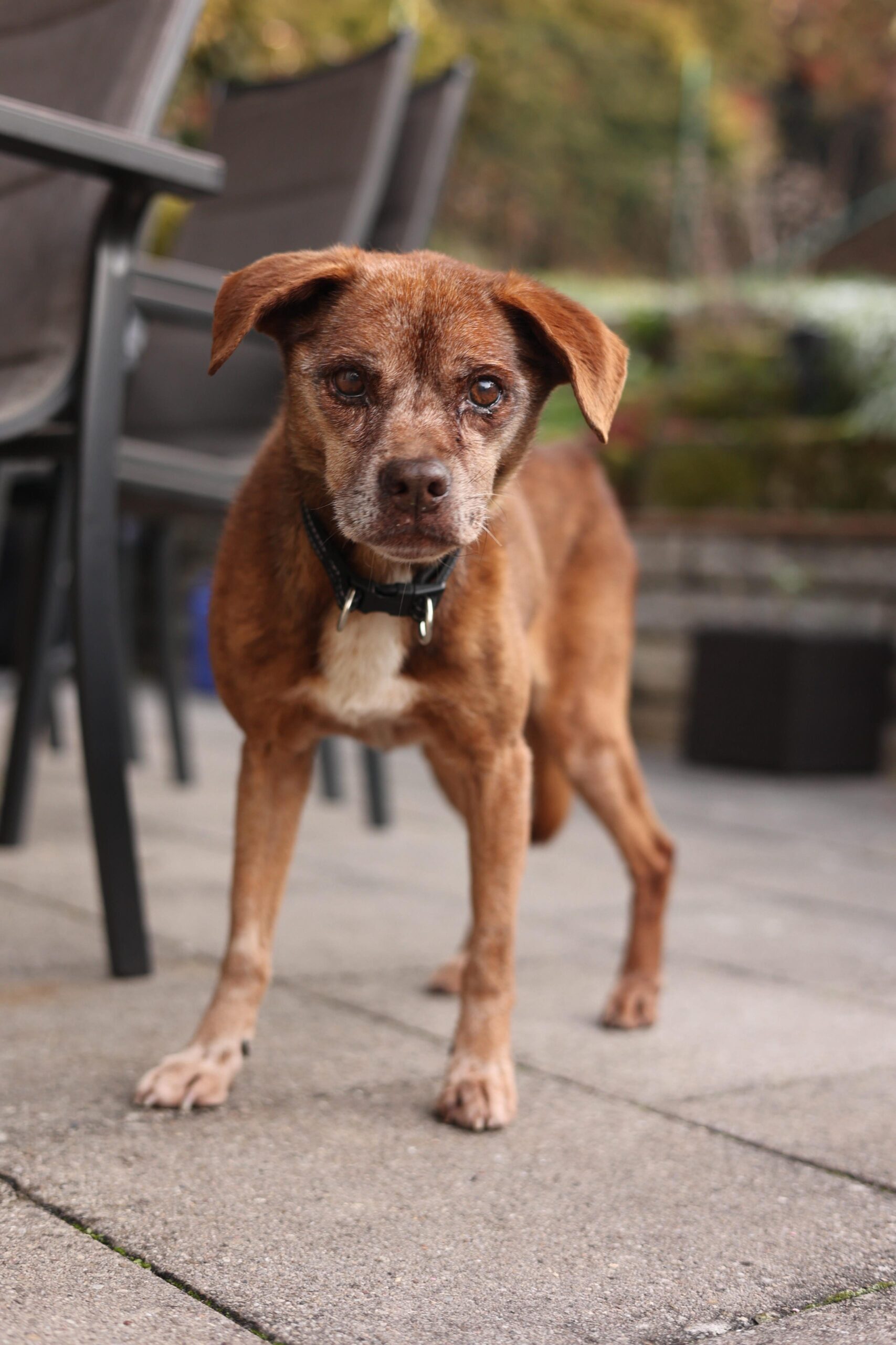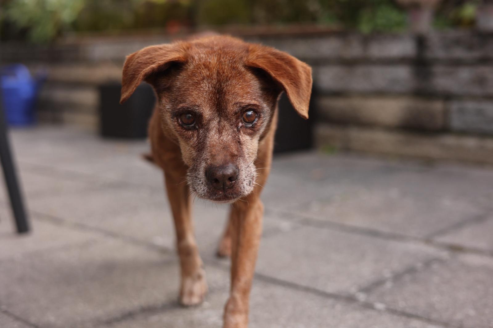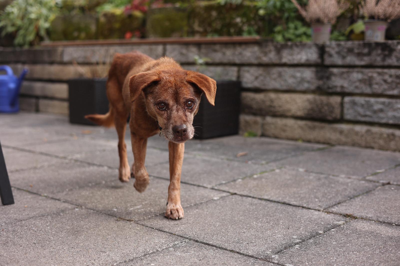 Er ist ein vorsichtiger, sensibler Hund. Laute Geräusche, Hektik oder schnelle Bewegungen verunsichern ihn. Seine Beine und Hüften sind steif, und seine Augen sehen nicht mehr so gut – doch sein Bedürfnis nach Nähe, Wärme und Sicherheit ist größer denn je.