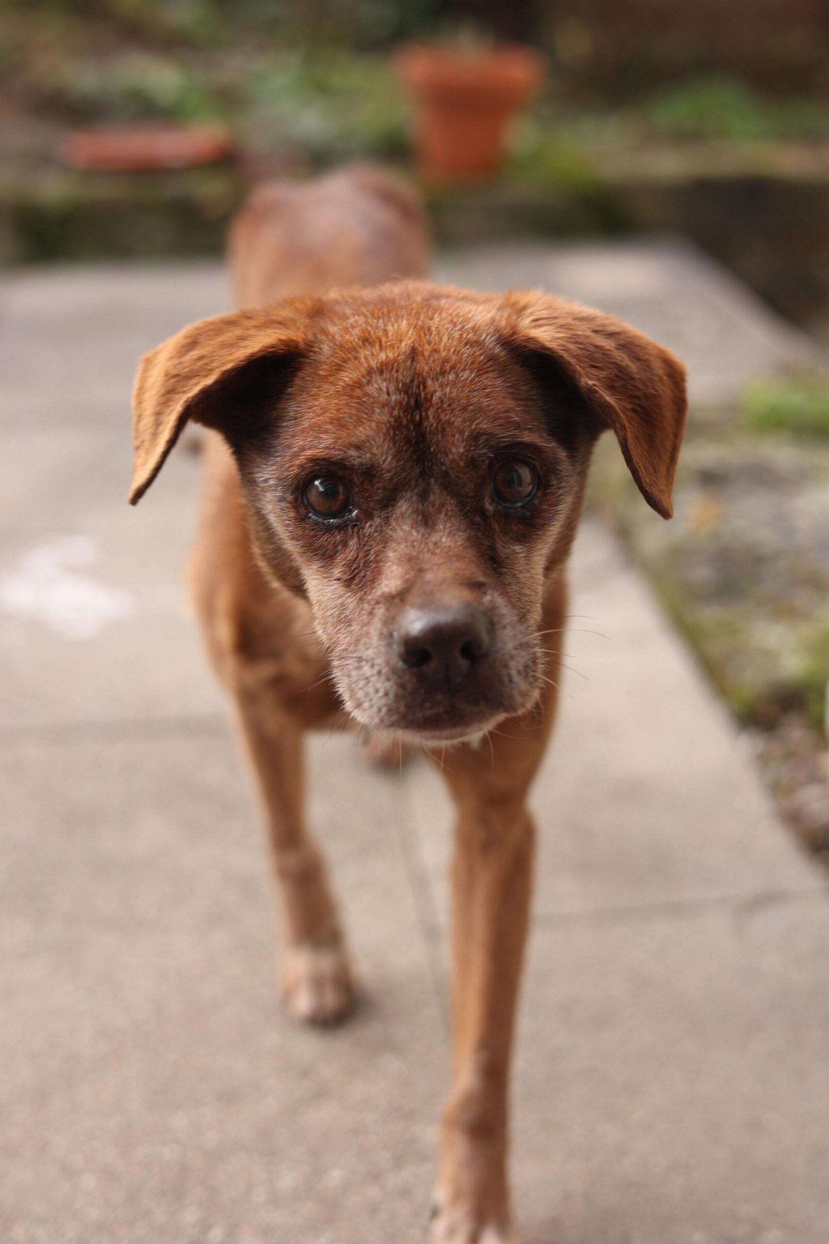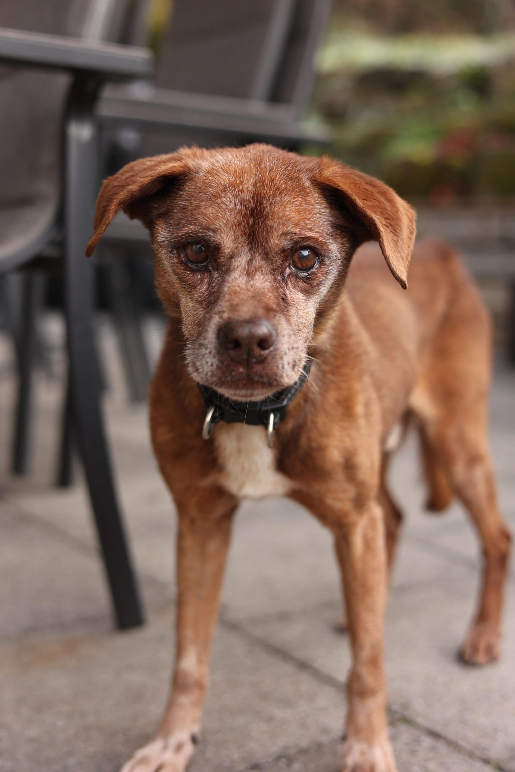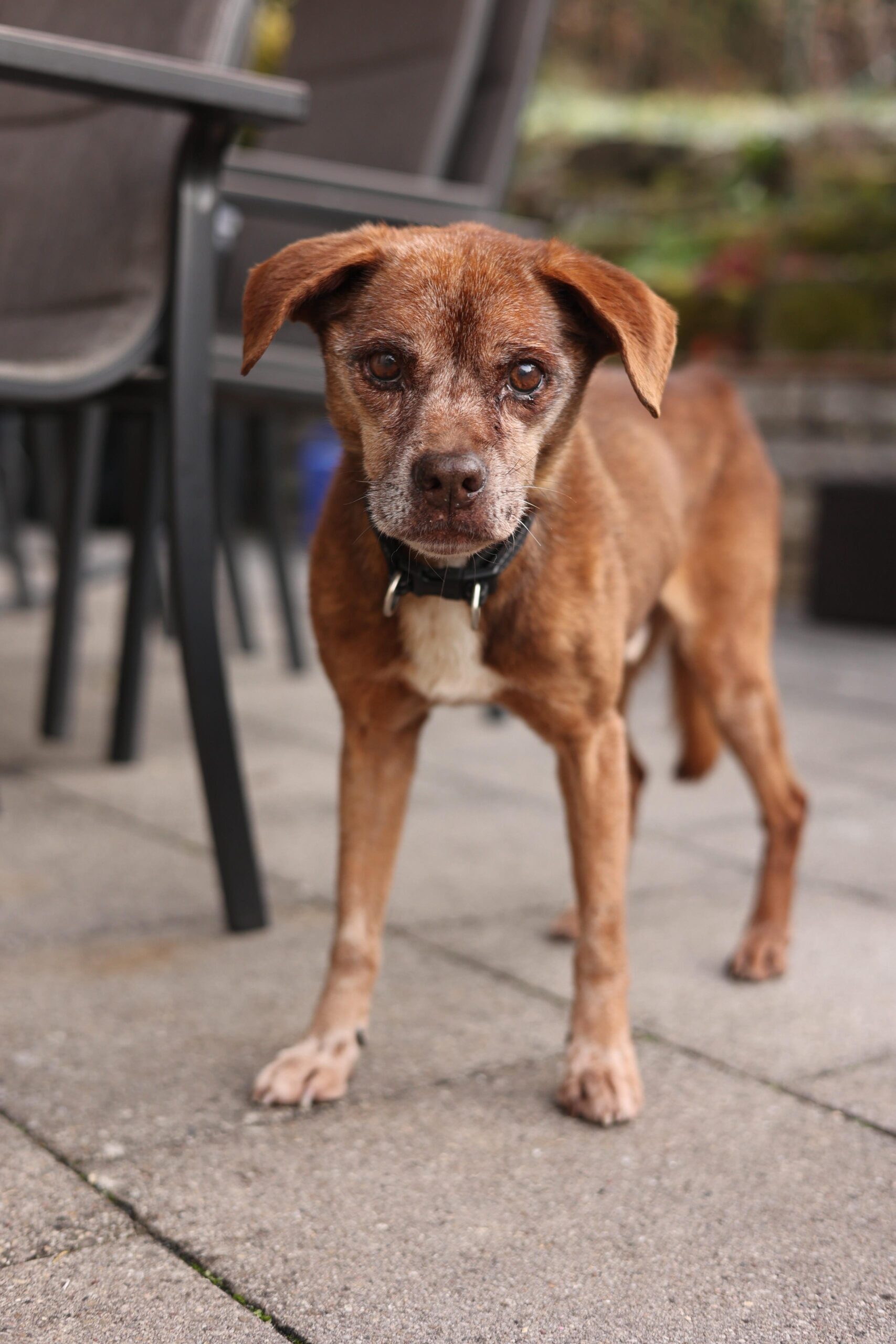 Er ist ein vorsichtiger, sensibler Hund. Laute Geräusche, Hektik oder schnelle Bewegungen verunsichern ihn. Seine Beine und Hüften sind steif, und seine Augen sehen nicht mehr so gut – doch sein Bedürfnis nach Nähe, Wärme und Sicherheit ist größer denn je.