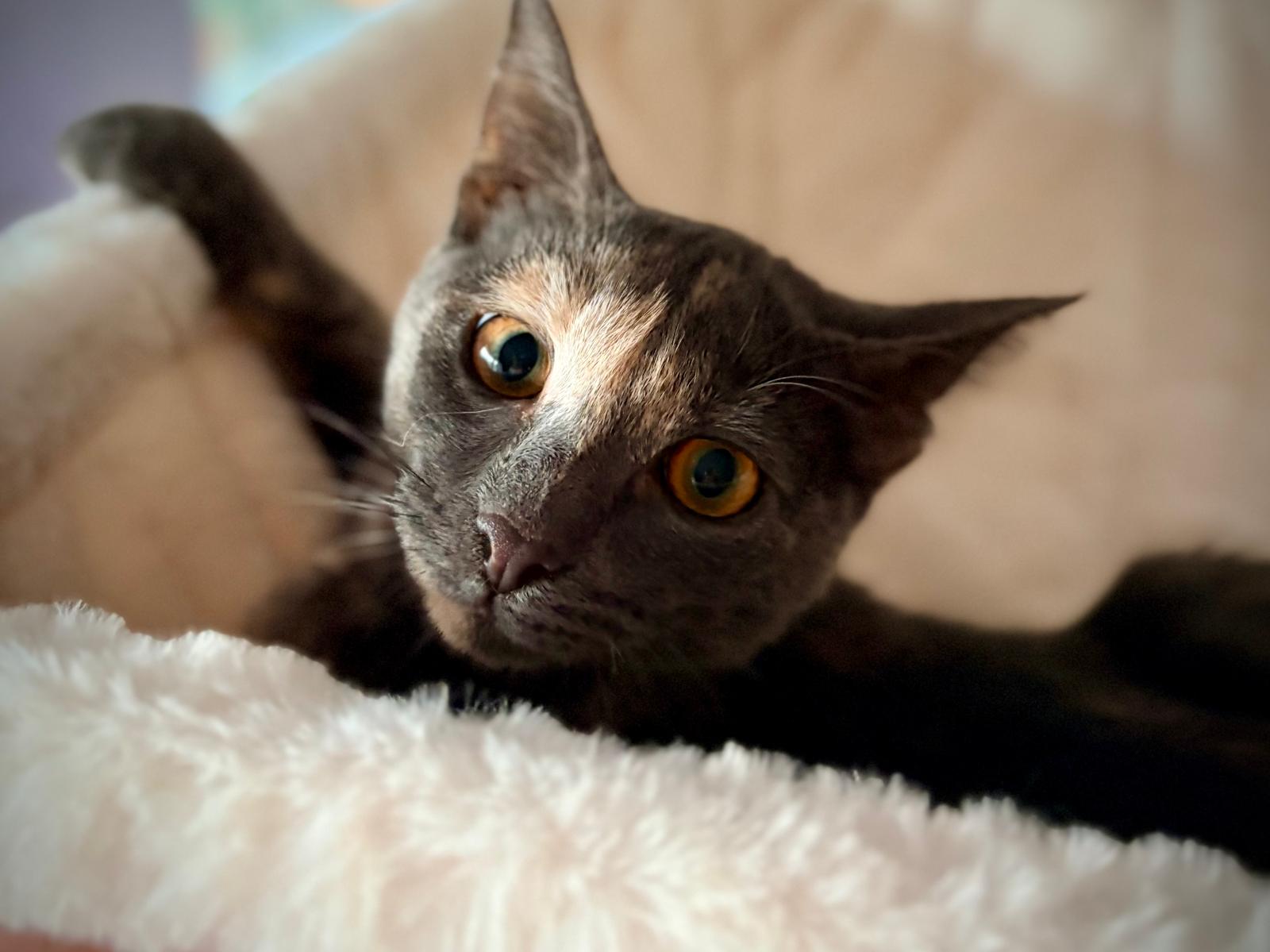 Herta ist eine besonders verschmuste junge Katze, die es liebt, gestreichelt zu werden. In ihrer Pflegestelle lebt sie mit anderen Katzen zusammen und zeigt sich sehr sozial, deshalb wünschen wir uns für sie unbedingt einen Spielpartner im ähnlichen Alter in ihrem neuen Zuhause. Denn junge Katzen brauchen nicht nur Liebe, sondern auch jemanden zum Toben, Raufen und Kuscheln.