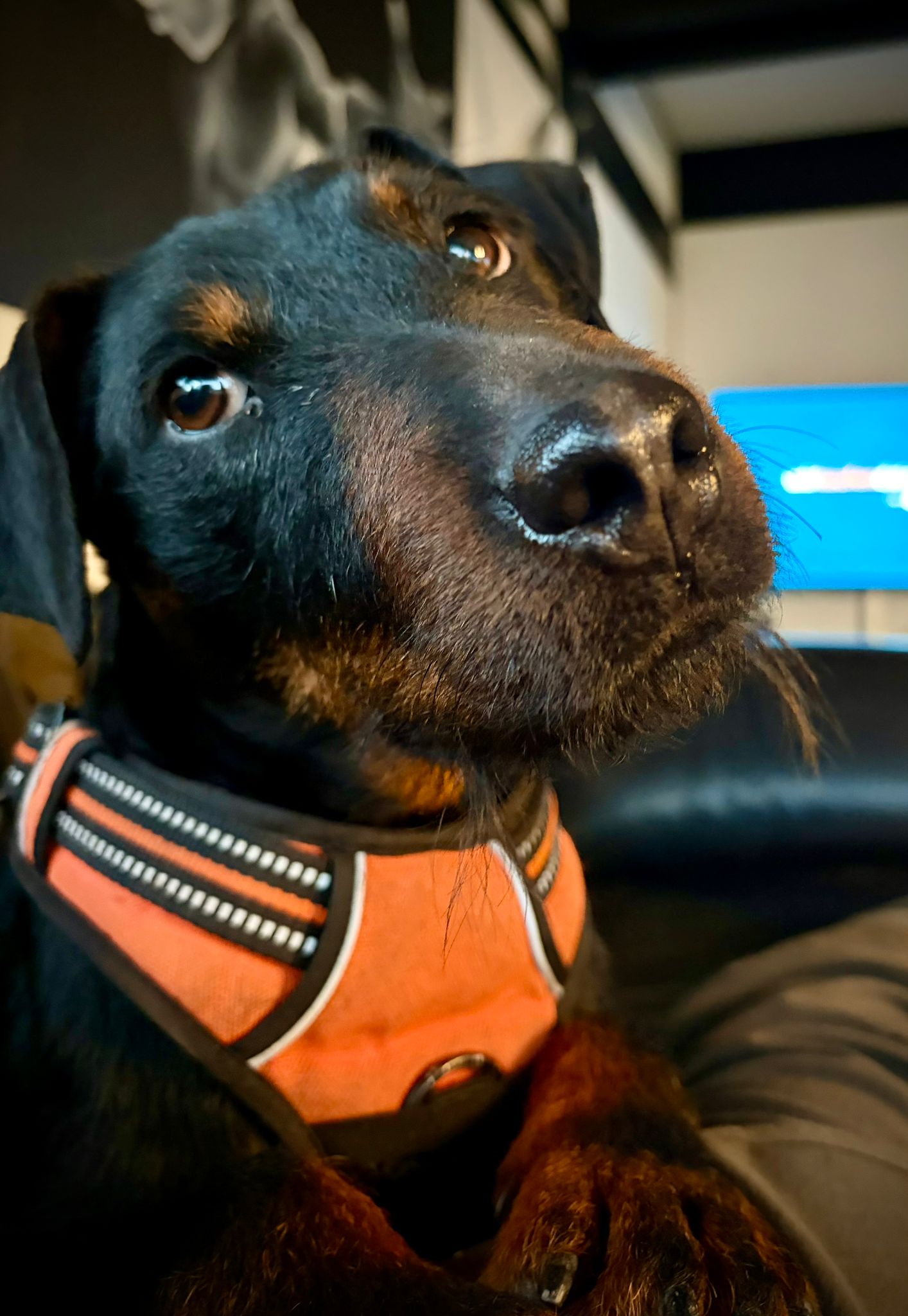 Sein Jagdtrieb ist stark – draußen ist er oft „in seiner eigenen Welt“. Mäuse, Pferde, andere Hunde: alles ist spannend. Freilauf ist aktuell nicht möglich, die Bindung reicht dafür noch nicht. Außerdem ist er sehr sprungstark und würde jede Gelegenheit zum Ausbüxen nutzen, wenn man ihn nicht gut sichert. Katzen sind für ihn absolut tabu.