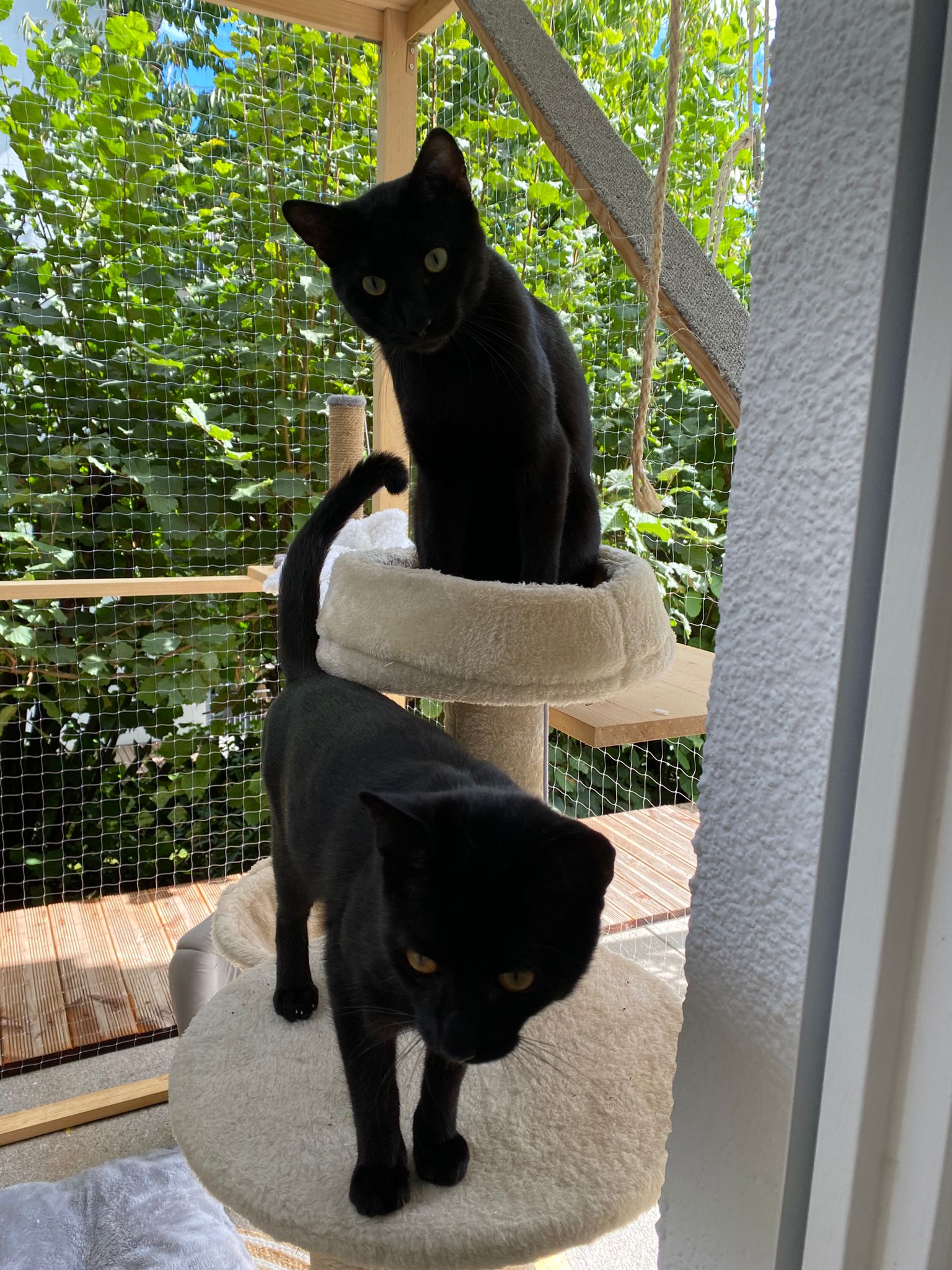 Besonders gerne thronen sie auf dem Schrank und beobachten das Geschehen von oben – oder sie genießen die Aussicht im Katzengehege, wo sie fasziniert Vögel und Insekten auflauern. Ihre ruhigen Beobachtungsmomente wechseln sich ab mit ausgelassenem Spielen und Schmuseeinheiten.