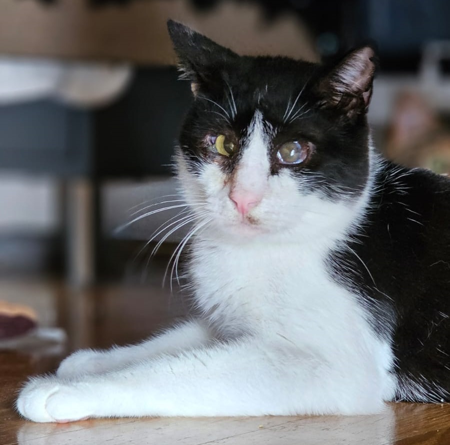 Anfangs ist er etwas schüchtern, weil er nicht so gut sehen kann, aber sobald er sich entspannt und seine Umgebung kennt, ist er ein absolut verschmuster Kater. Auch mit Hunden hat er keine Probleme, sofern diese ihn nicht jagen.